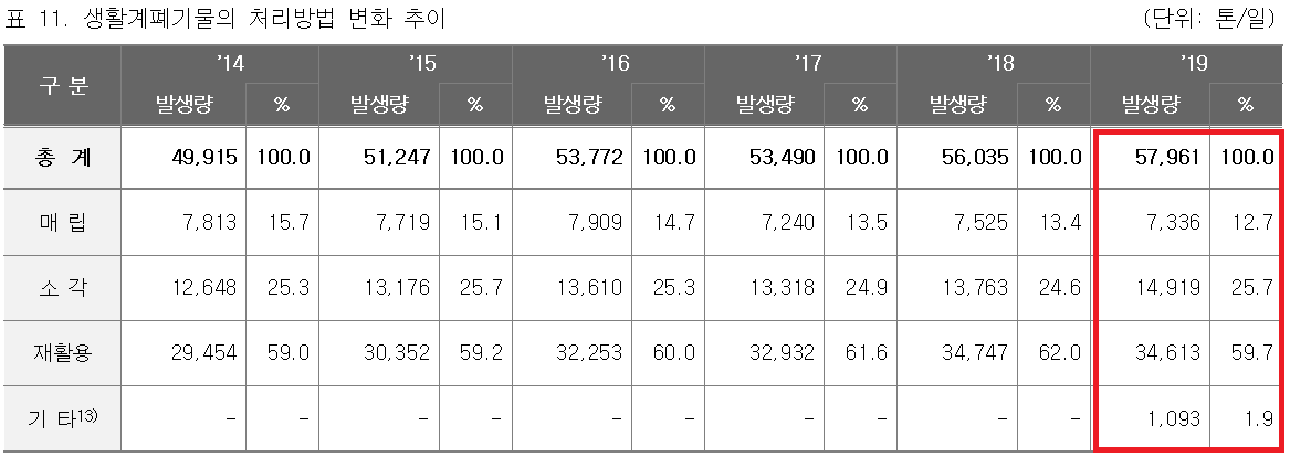 위에 기록된 표를 보면 총 폐기물 발생량은 매년 꾸준히 증가하고 있습니다. 비록 2019년도의 자료이긴 하지만, 이 글을 쓰는 2023년에는 더 많은 폐기물들이 버려지고 있겠죠? 어떻게 처리가 되고 있는지를 보기 전에, 이렇게 통계적으로 봤을 때 우리는 점점 더 많은 쓰레기를 버리고 있다는 것이 조금은 더 와닿는 느낌입니다.