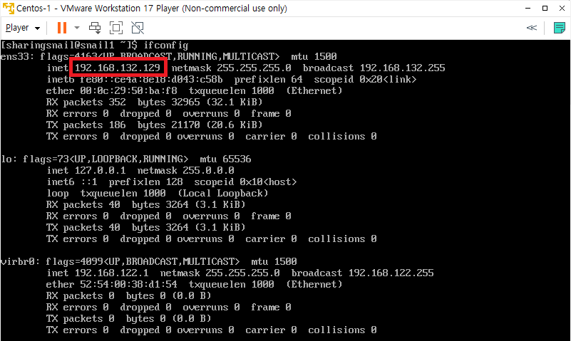 이후에 각 VM의 네트워크 IP를 확인합니다. 리눅스 명령어 ifconfig를 활용하시면 됩니다.