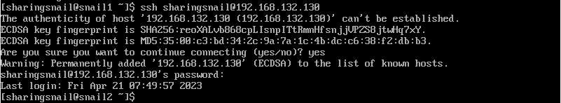이후 1번 VM에서 2번 VM으로 ssh 접속을 시도하면 아래와 같이 성공적으로 접속됨을 확인하실 수 있습니다.