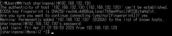 이후에 Windows 명령 프롬프트에서 2번 VM에 접속을 시도하면 아래와 같이 성공적으로 접속됨을 알 수 있습니다.